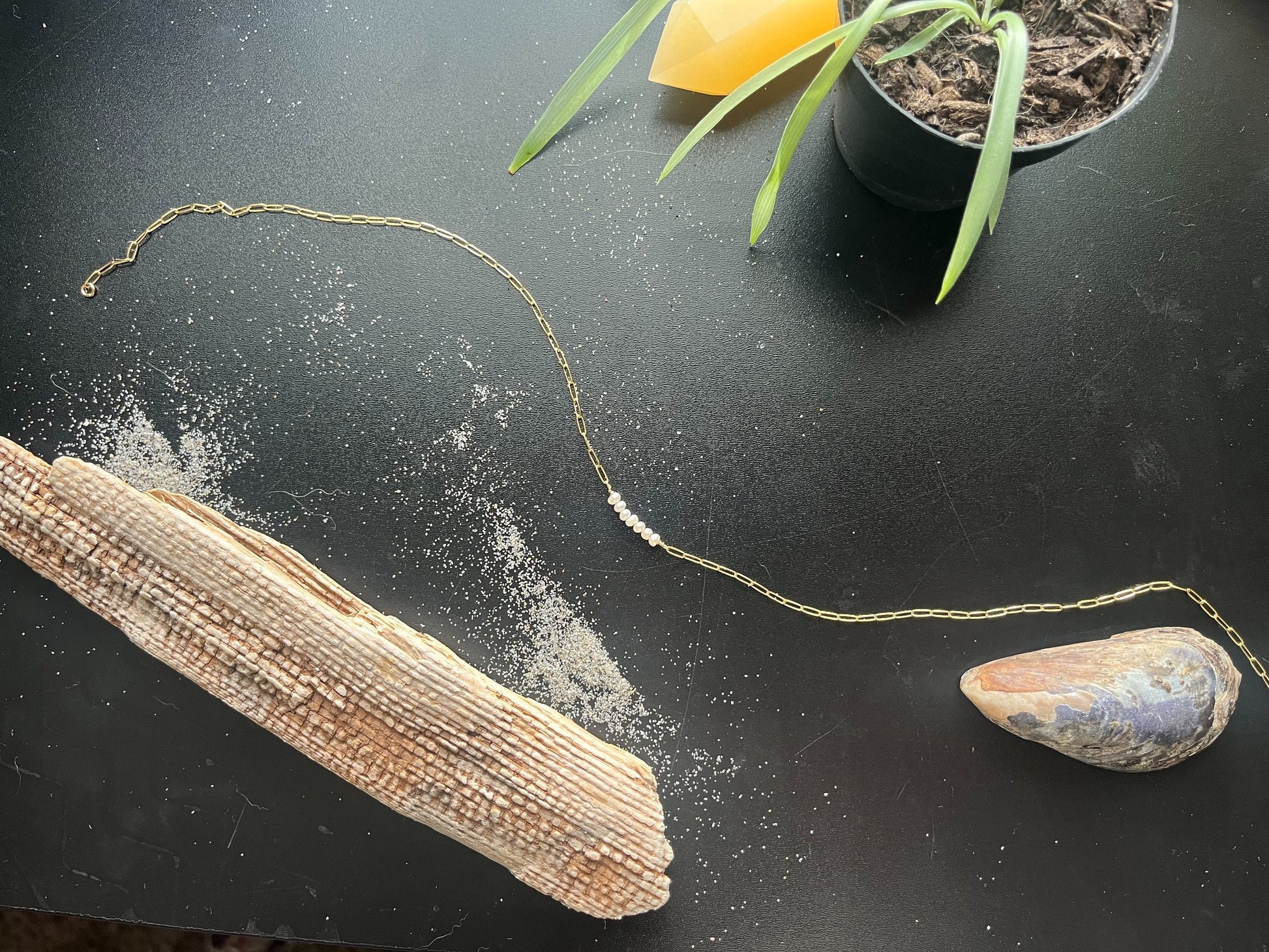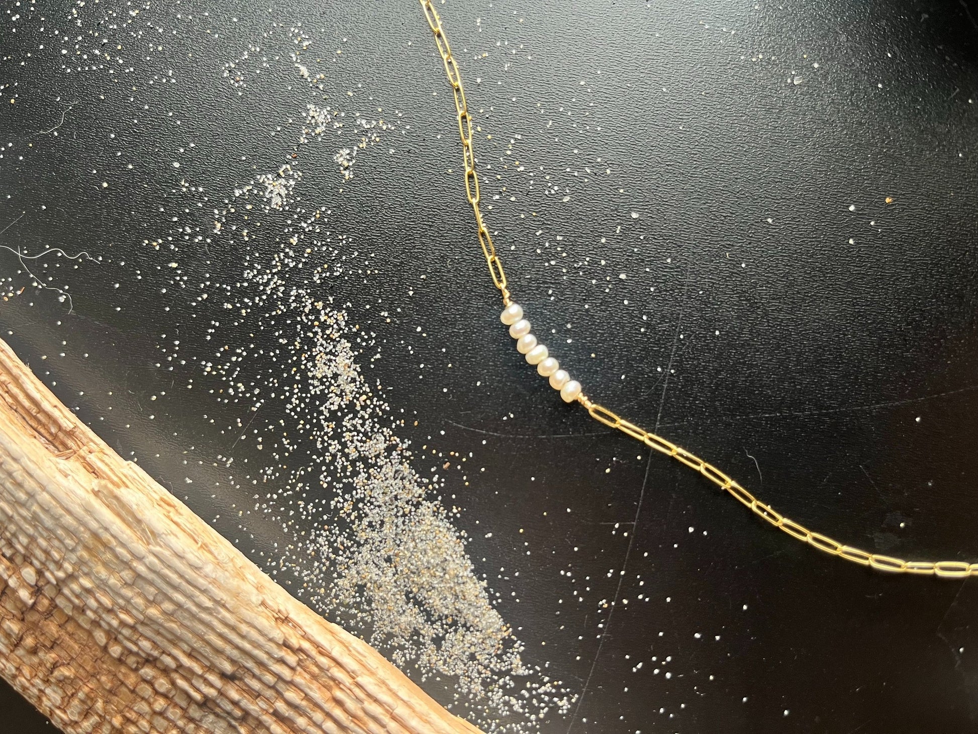 Tiny white freshwater pearls are strung onto a lovely 14k gold filled chain.